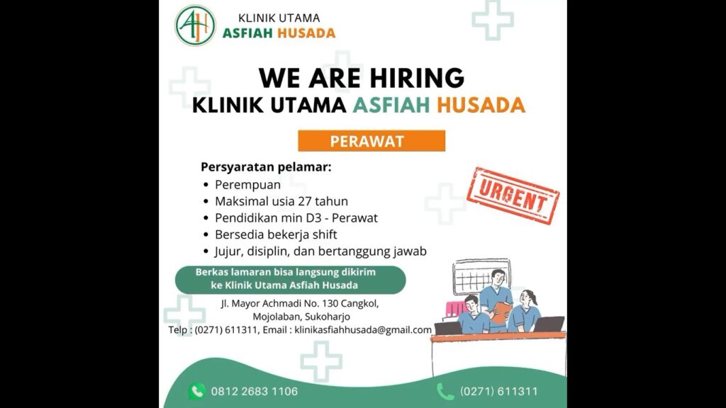 Klinik Utama Asfiah Husada saat ini membuka lowongan kerja untuk posisi Perawat dengan kebutuhan yang bersifat urgent. Posisi ini diperuntukkan bagi perempuan dengan usia maksimal 27 tahun, memiliki pendidikan minimal D3 Keperawatan, serta bersedia bekerja dalam sistem shift. Kandidat juga diharapkan memiliki sifat jujur, disiplin, dan bertanggung jawab.