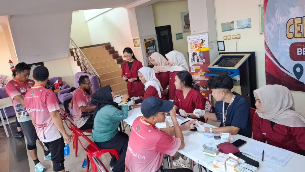 Mahasiswa Fakultas Kesehatan Universitas Harapan Bangsa kembali menunjukkan kepeduliannya terhadap kesehatan masyarakat dengan mengadakan kegiatan pemeriksaan kesehatan gratis dalam rangkaian acara UHB Charity 5K Fun Run yang dilaksanakan pada hari Minggu, 20 Juli 2025. Kegiatan ini merupakan kolaborasi dari tiga himpunan mahasiswa, yaitu Himpunan Mahasiswa Anestesi (HIMANES), Himpunan Mahasiswa Sarjana Keperawatan (HIMSAKA), dan Himpunan Mahasiswa Diploma Tiga Keperawatan (HIMADIKA) Di bawah bimbingan Bapak Dr. Made Suandika, S.Kep., Ns., M.Kep., RN., AOCNS., Ph.D melaksanakan pelayanan kesehatan secara langsung kepada masyarakat peserta fun run. Jenis pemeriksaan yang dilakukan meliputi pengecekan tekanan darah, saturasi oksigen, denyut nadi, laju pernapasan, berat badan, tinggi badan, indeks massa tubuh (IMT), serta pemeriksaan laboratorium sederhana seperti kadar kolesterol, gula darah sewaktu (GDS), dan asam urat. Kegiatan ini berhasil menjangkau lebih dari 200 peserta yang dengan antusias memanfaatkan layanan kesehatan tersebut. Selain menjadi sarana penerapan ilmu keperawatan secara nyata, kegiatan ini juga merupakan bentuk kontribusi mahasiswa dalam meningkatkan kesadaran masyarakat akan pentingnya deteksi dini terhadap risiko penyakit.